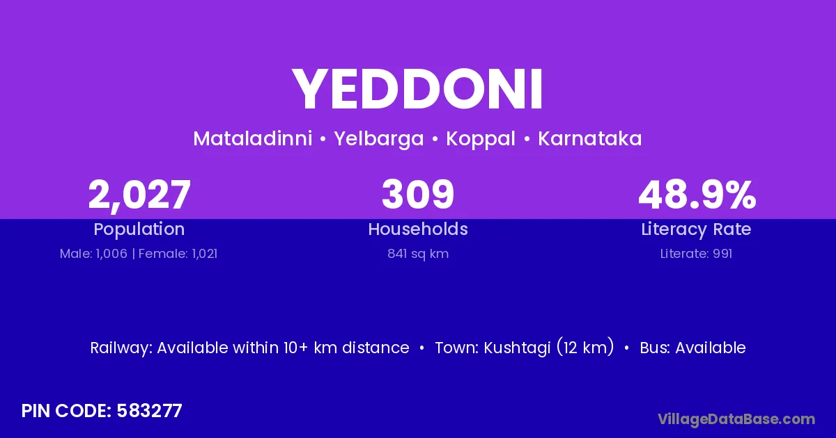 Kushtagi (12 km) is the nearest town to Yeddoni village for major economic activities and is located approximately 12 km away.