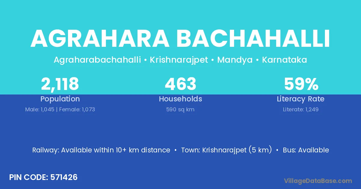 Krishnarajpet (5 km) is the nearest town to Agrahara Bachahalli village for major economic activities and is located approximately 5 km away.