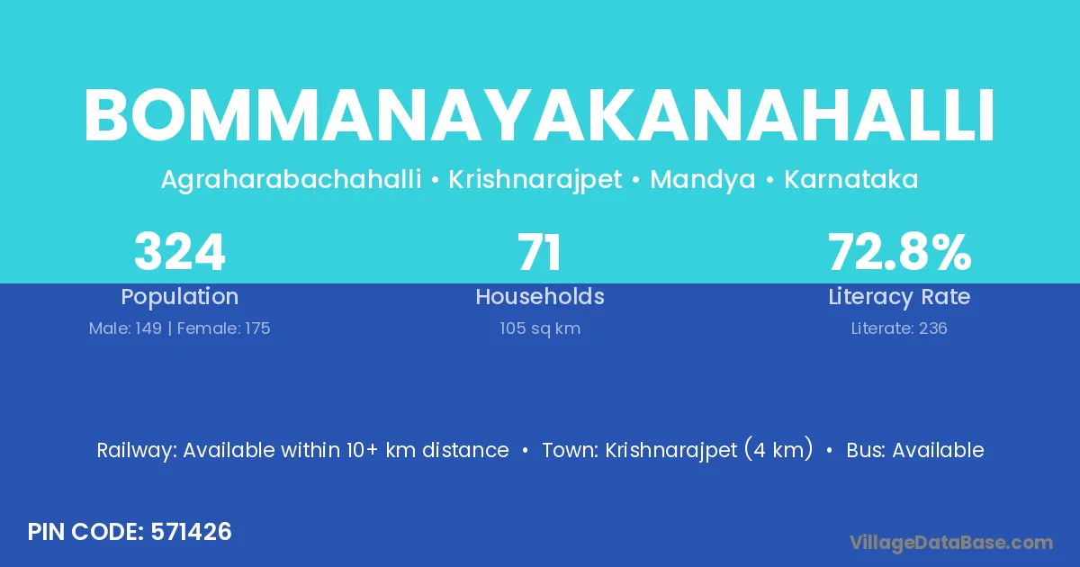 Krishnarajpet (4 km) is the nearest town to Bommanayakanahalli village for major economic activities and is located approximately 4 km away.