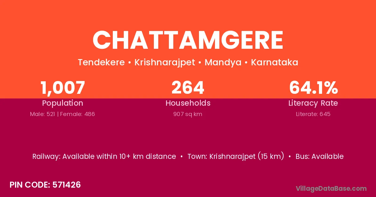 Krishnarajpet (15 km) is the nearest town to Chattamgere village for major economic activities and is located approximately 15 km away.