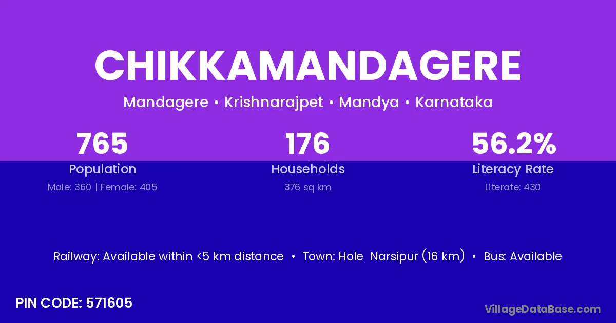 Hole Narsipur (16 km) is the nearest town to Chikkamandagere village for major economic activities and is located approximately 16 km away.
