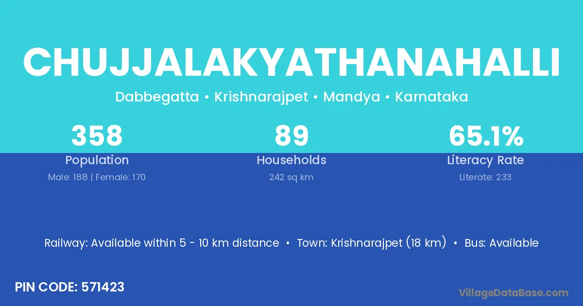 Chujjalakyathanahalli village has a total population of 358 people, of which 188 are males and 170 are females.