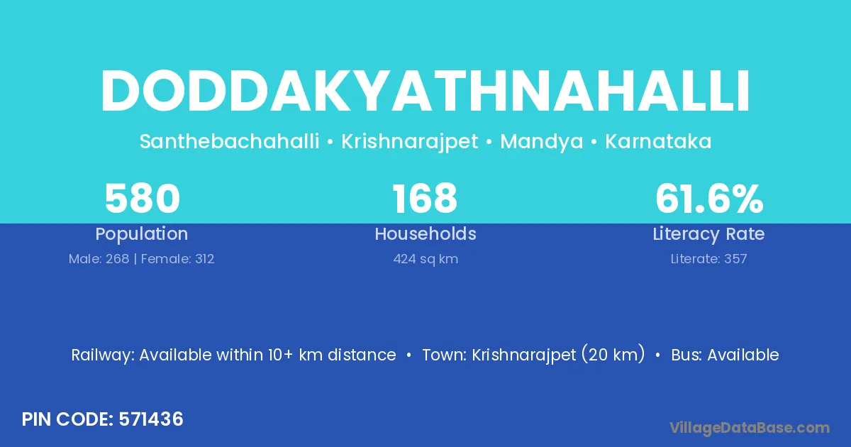 Krishnarajpet (20 km) is the nearest town to Doddakyathnahalli village for major economic activities and is located approximately 20 km away.