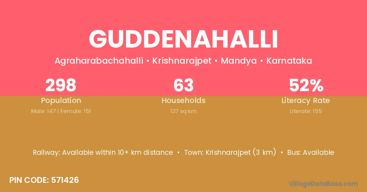 Krishnarajpet (3 km) is the nearest town to Guddenahalli village for major economic activities and is located approximately 3 km away.