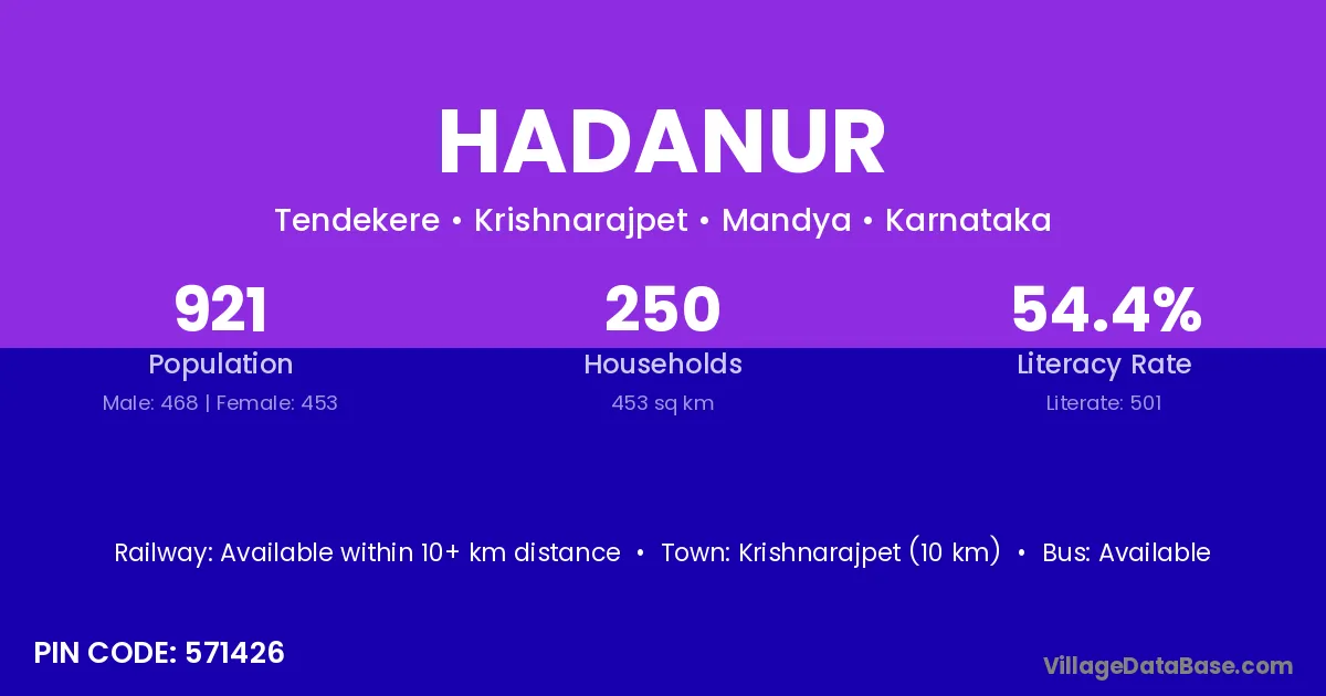 Krishnarajpet (10 km) is the nearest town to Hadanur village for major economic activities and is located approximately 10 km away.