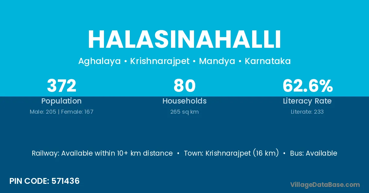 Krishnarajpet (16 km) is the nearest town to Halasinahalli village for major economic activities and is located approximately 16 km away.