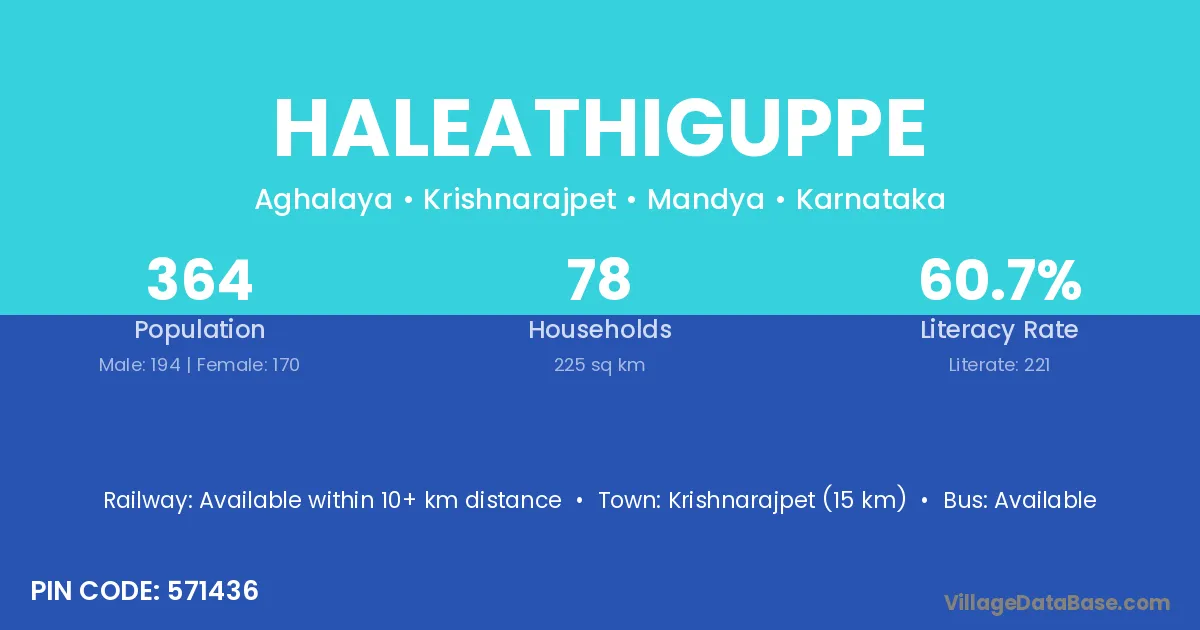 Krishnarajpet (15 km) is the nearest town to Haleathiguppe village for major economic activities and is located approximately 15 km away.