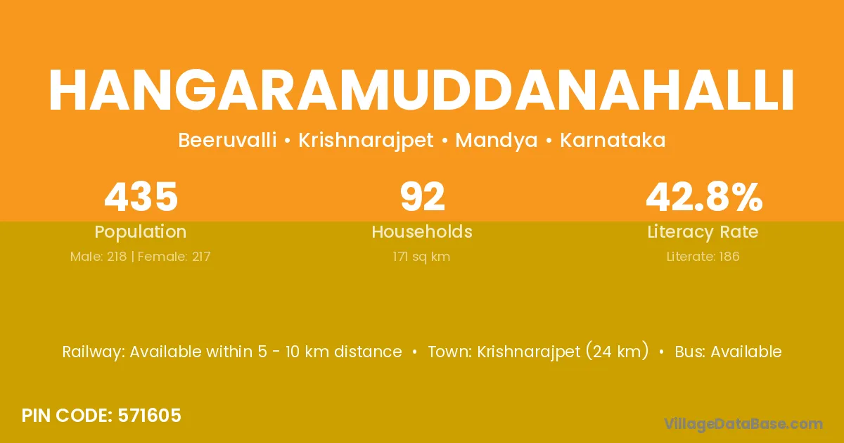 Krishnarajpet (24 km) is the nearest town to Hangaramuddanahalli village for major economic activities and is located approximately 24 km away.