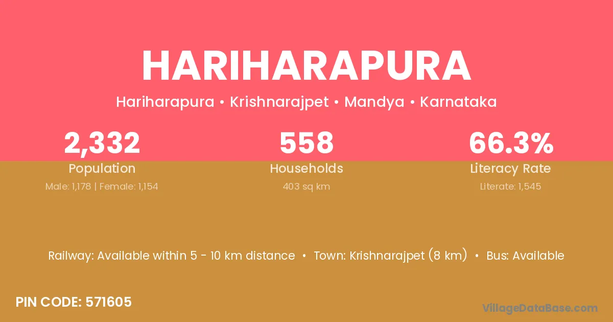 Krishnarajpet (8 km) is the nearest town to Hariharapura village for major economic activities and is located approximately 8 km away.