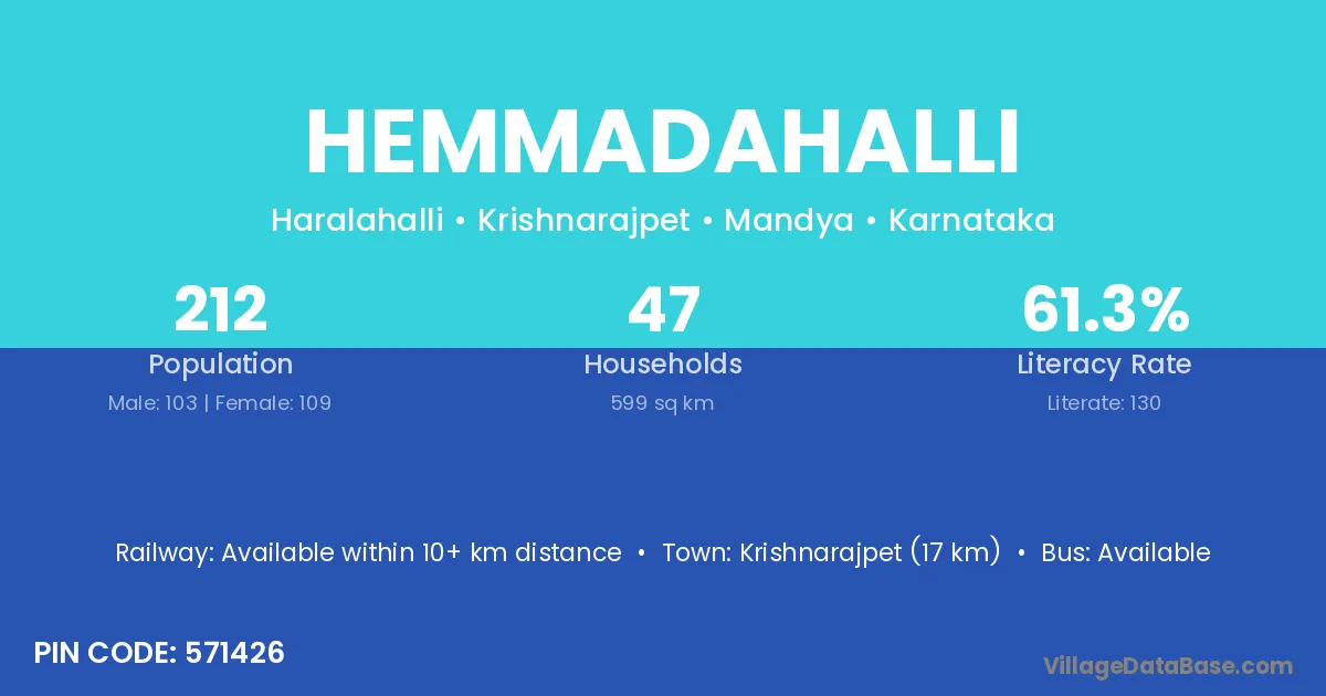Krishnarajpet (17 km) is the nearest town to Hemmadahalli village for major economic activities and is located approximately 17 km away.