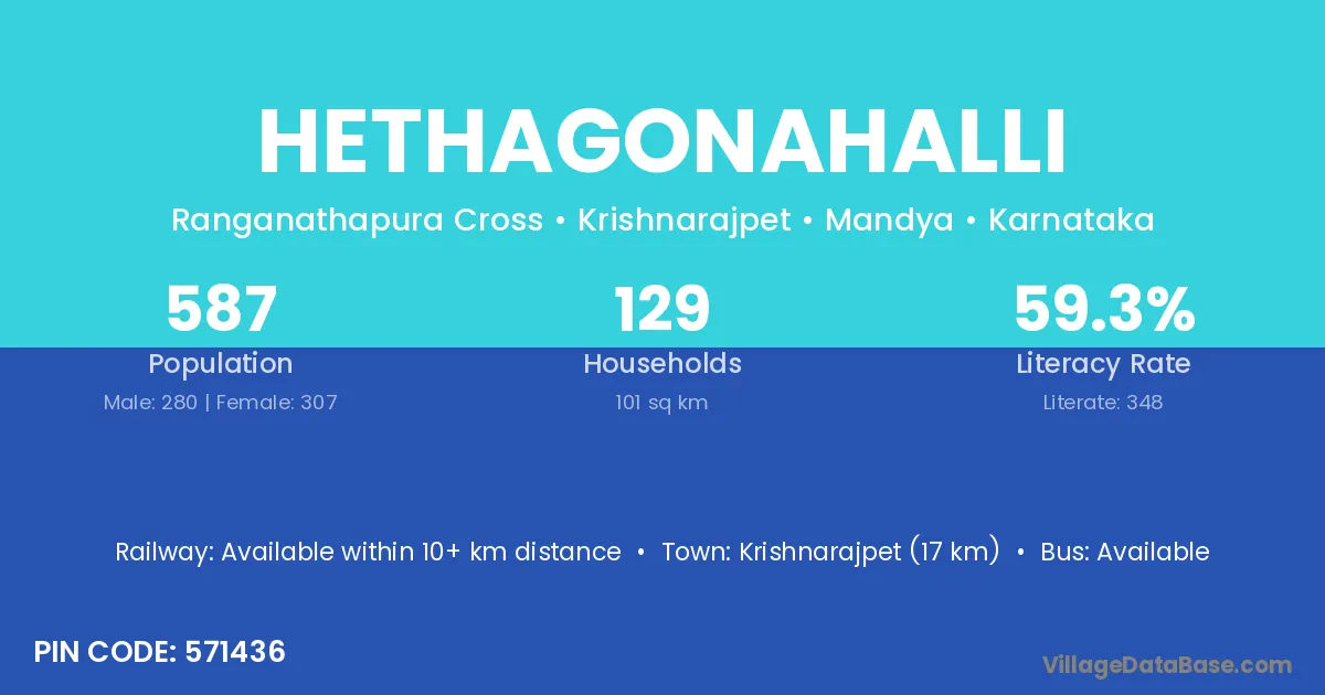 Krishnarajpet (17 km) is the nearest town to Hethagonahalli village for major economic activities and is located approximately 17 km away.