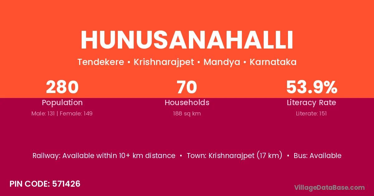 Krishnarajpet (17 km) is the nearest town to Hunusanahalli village for major economic activities and is located approximately 17 km away.