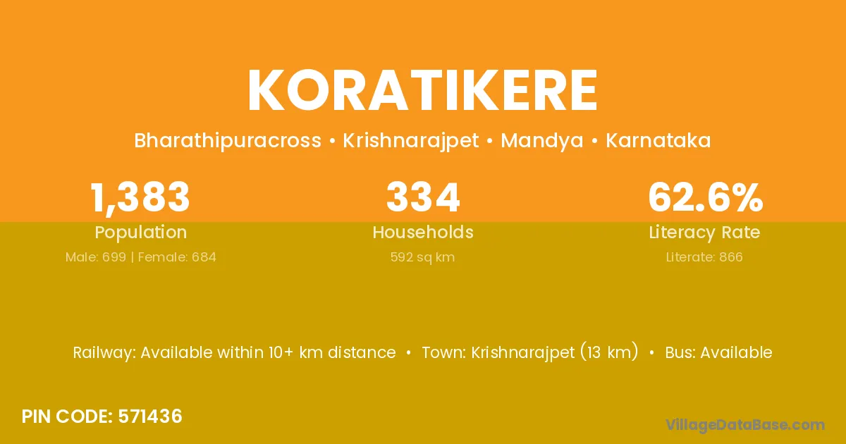 Krishnarajpet (13 km) is the nearest town to Koratikere village for major economic activities and is located approximately 13 km away.