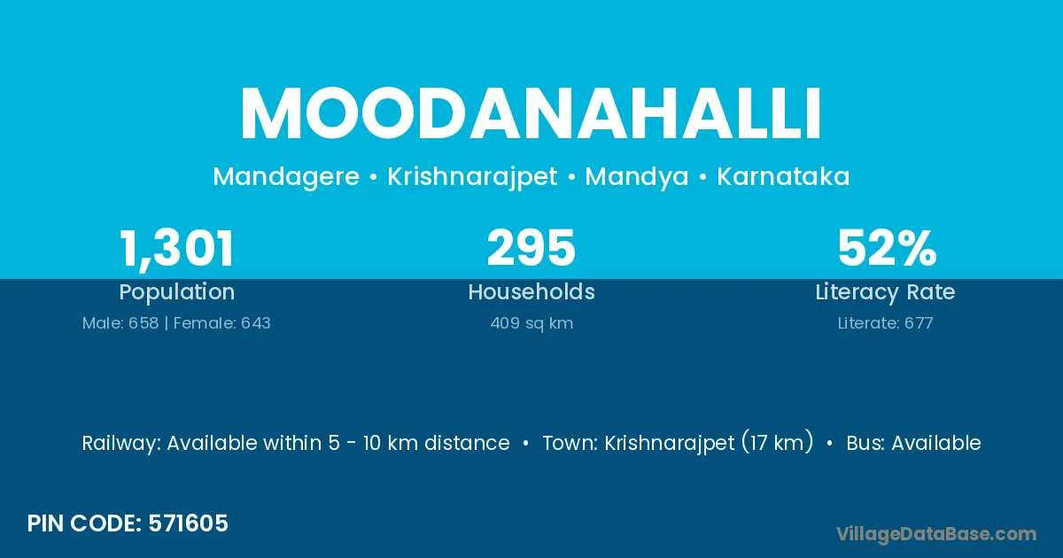 Krishnarajpet (17 km) is the nearest town to Moodanahalli village for major economic activities and is located approximately 17 km away.