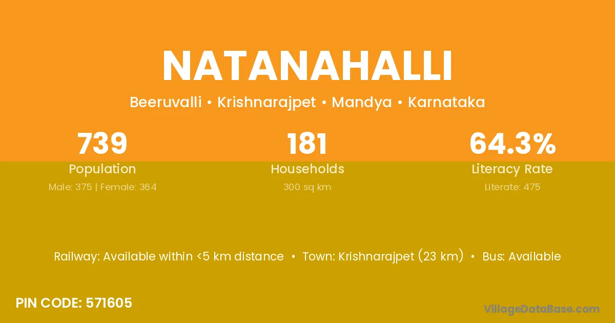 Krishnarajpet (23 km) is the nearest town to Natanahalli village for major economic activities and is located approximately 23 km away.