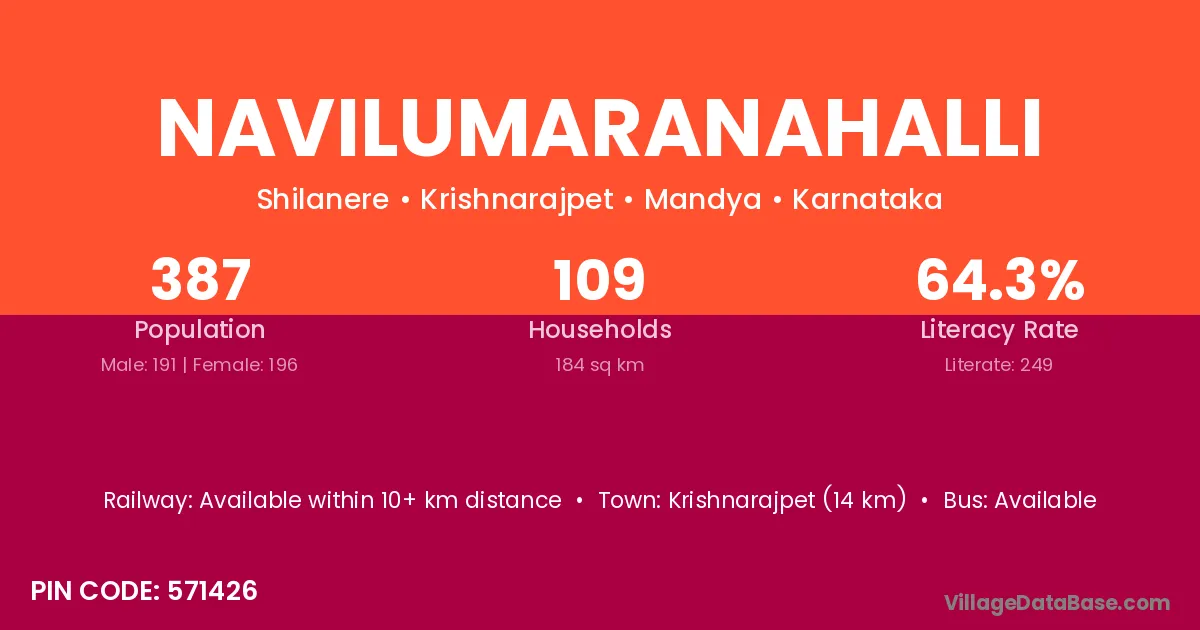 Krishnarajpet (14 km) is the nearest town to Navilumaranahalli village for major economic activities and is located approximately 14 km away.