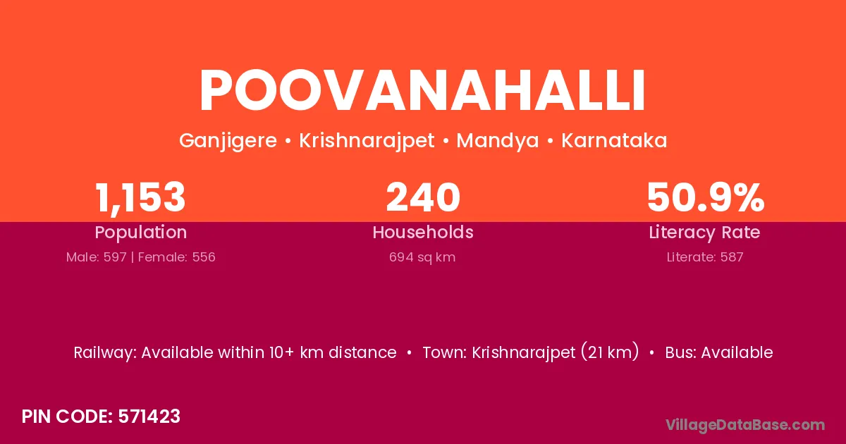 Poovanahalli village has a total population of 1,153 people, of which 597 are males and 556 are females.