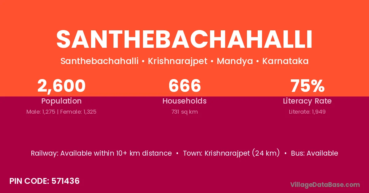 Krishnarajpet (24 km) is the nearest town to Santhebachahalli village for major economic activities and is located approximately 24 km away.