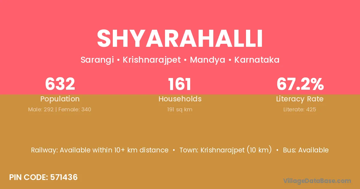 Krishnarajpet (10 km) is the nearest town to Shyarahalli village for major economic activities and is located approximately 10 km away.