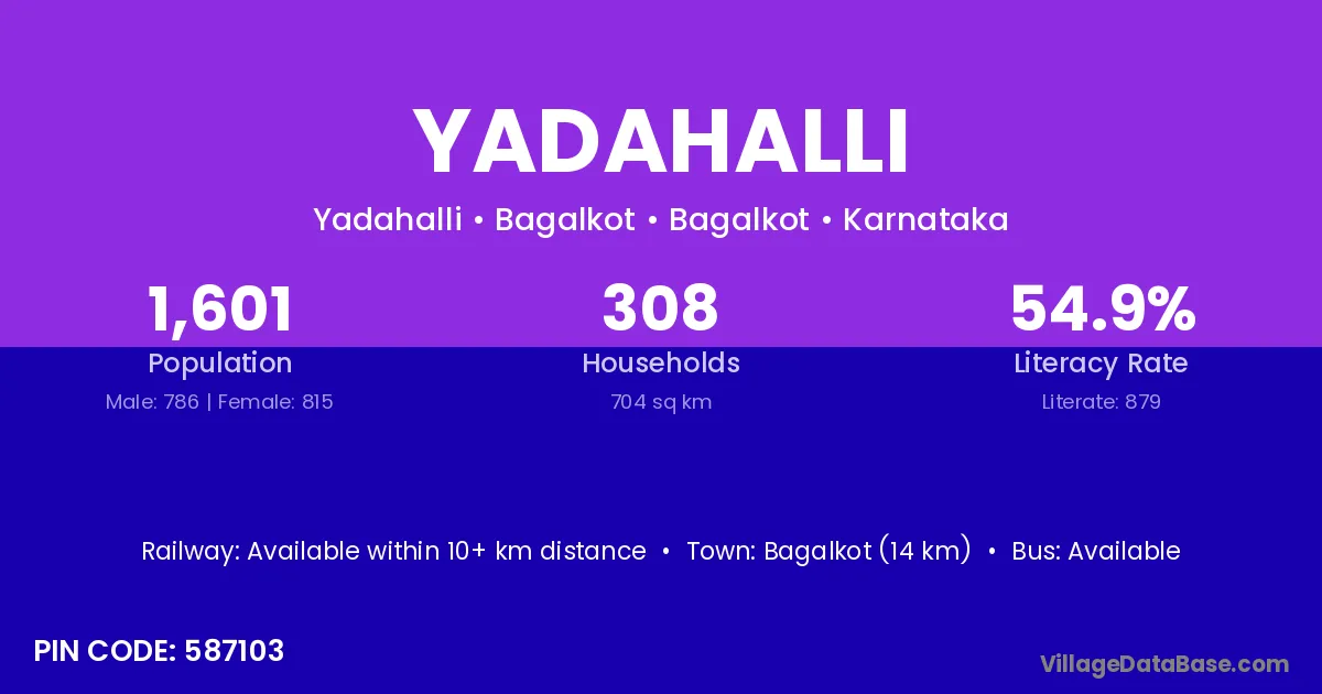 The literacy rate of Yadahalli village is 60.19%. Male literacy stands at 68.98% and female literacy at 50.86%.