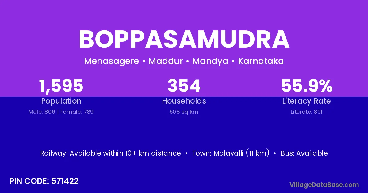 Malavalli (11 km) is the nearest town to Boppasamudra village for major economic activities and is located approximately 11 km away.
