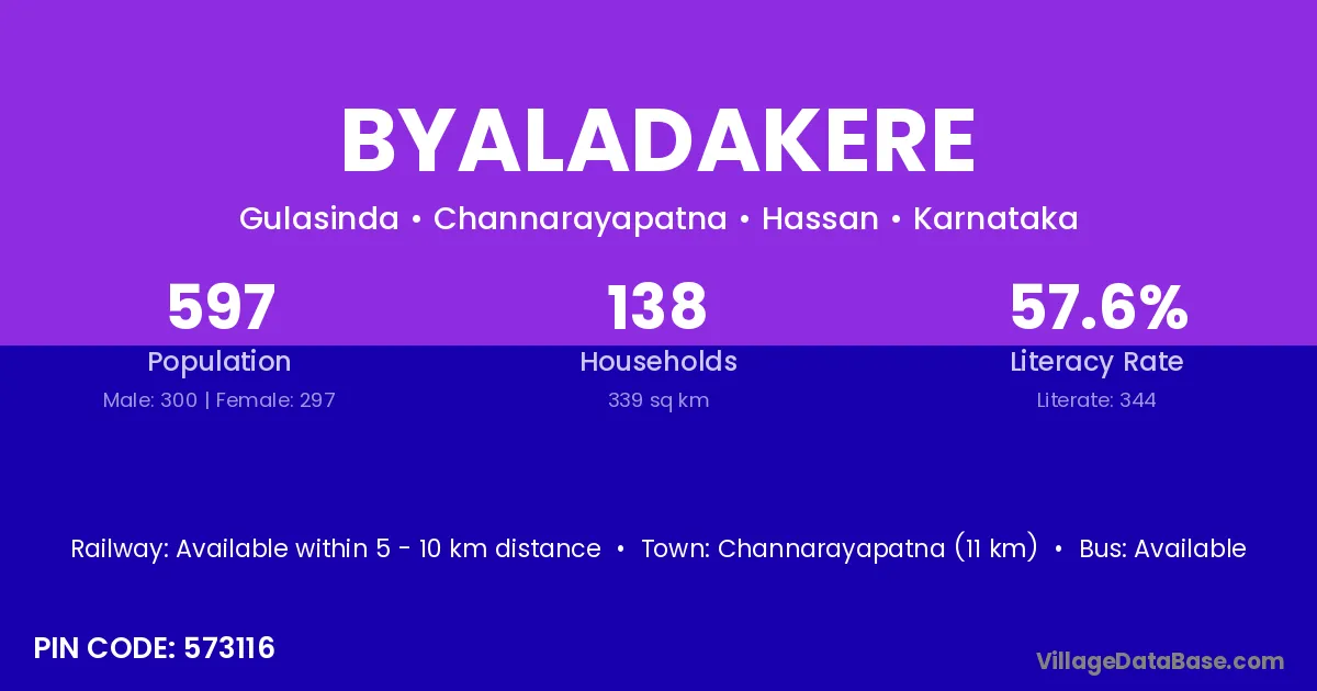 Maddur (25 km) is the nearest town to Byaladakere village for major economic activities and is located approximately 25 km away.