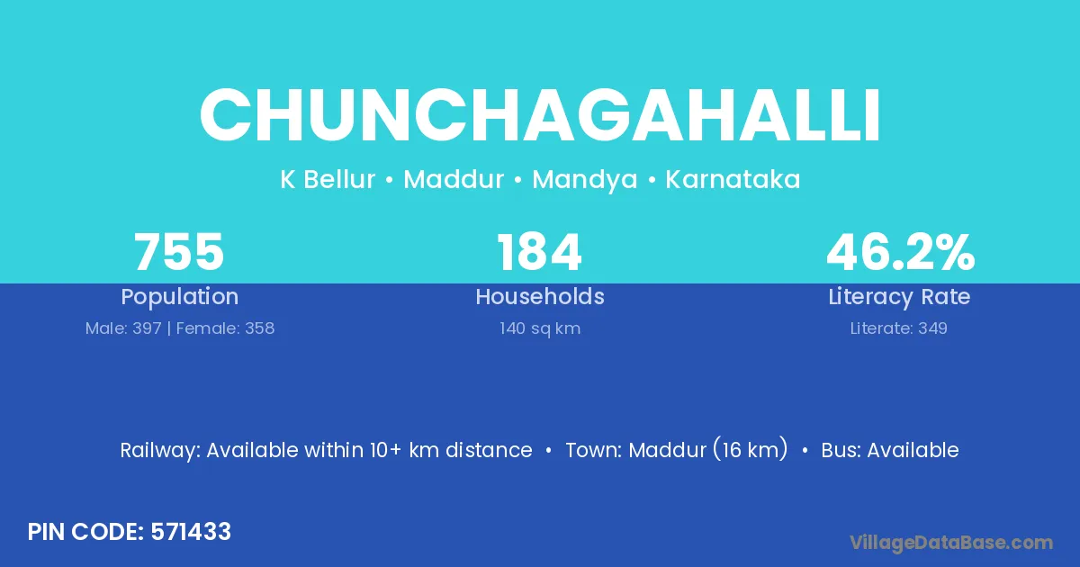 Maddur (16 km) is the nearest town to Chunchagahalli village for major economic activities and is located approximately 16 km away.