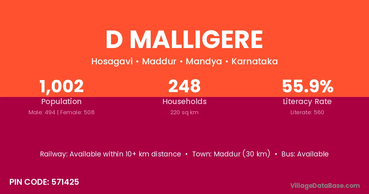 Maddur (30 km) is the nearest town to D Malligere village for major economic activities and is located approximately 30 km away.