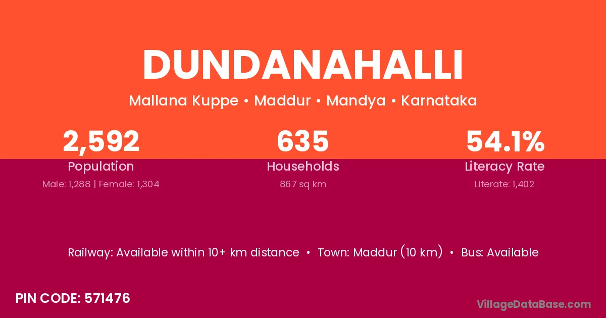 Maddur (10 km) is the nearest town to Dundanahalli village for major economic activities and is located approximately 10 km away.