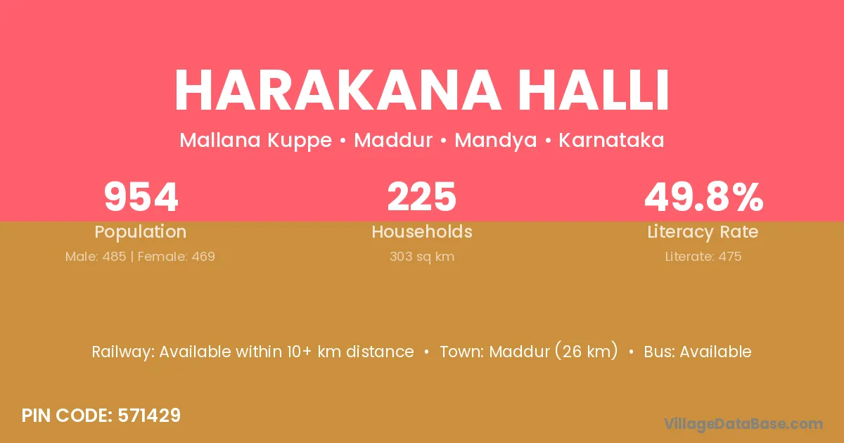 Maddur (26 km) is the nearest town to Harakana Halli village for major economic activities and is located approximately 26 km away.
