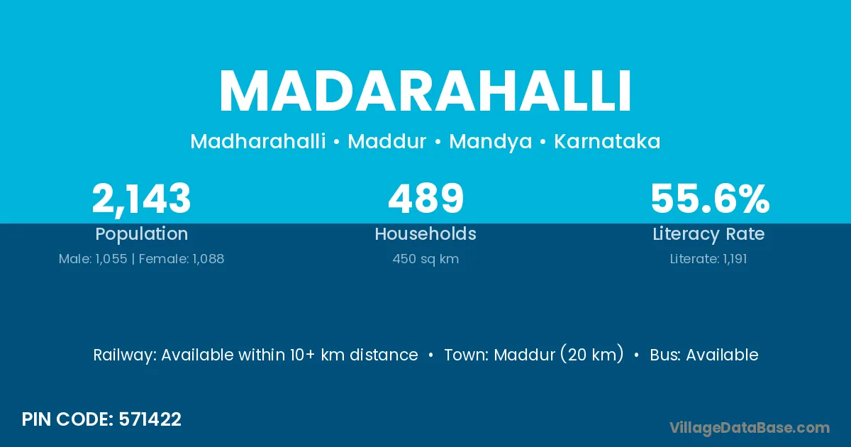 Maddur (20 km) is the nearest town to Madarahalli village for major economic activities and is located approximately 20 km away.