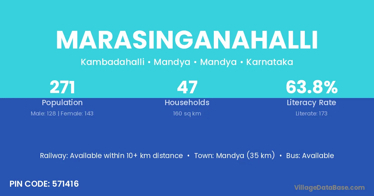 Maddur (12 km) is the nearest town to Marasinganahalli village for major economic activities and is located approximately 12 km away.