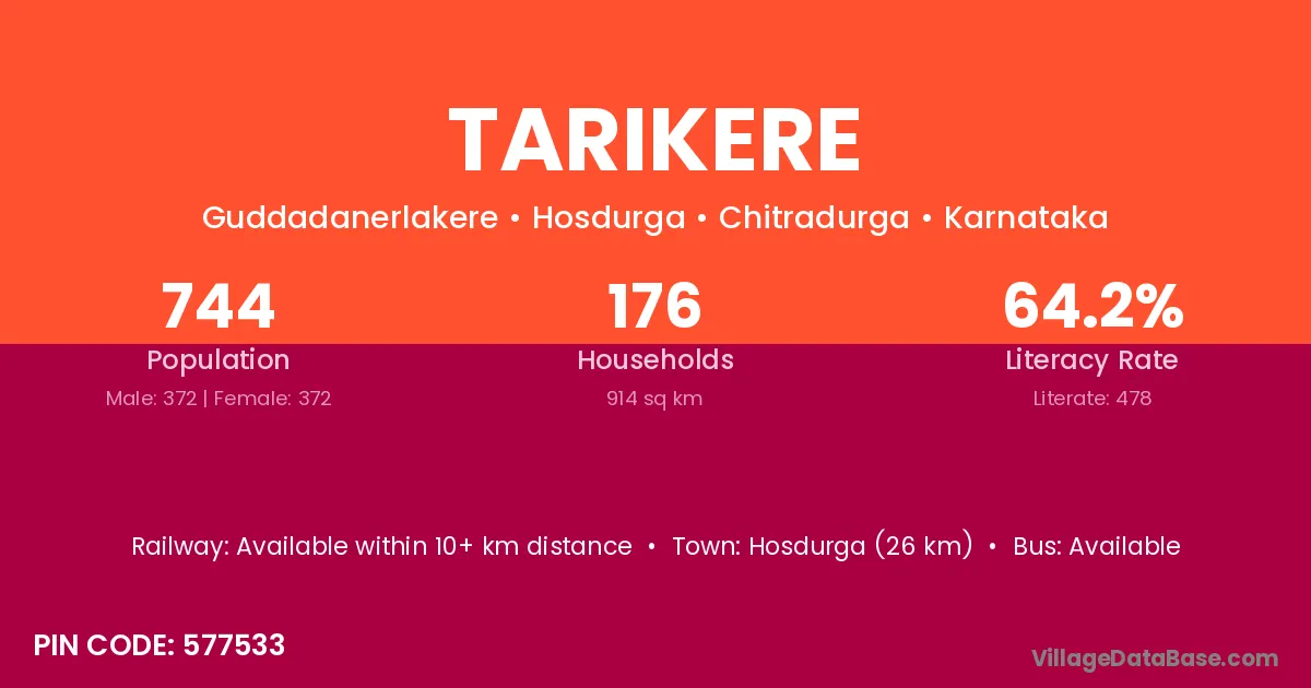 The literacy rate of Tarikere village is 62.35%. Male literacy stands at 73.19% and female literacy at 50.73%.