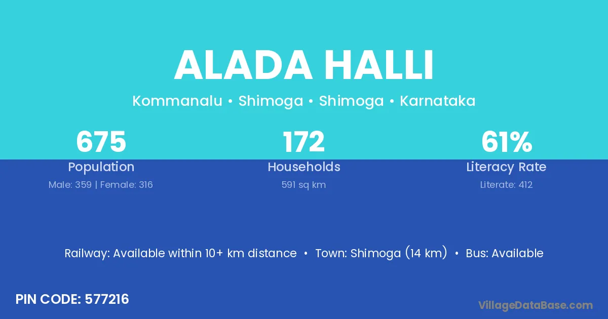 The literacy rate of Alada Halli village is 59.64%. Male literacy stands at 65.83% and female literacy at 53.50%.