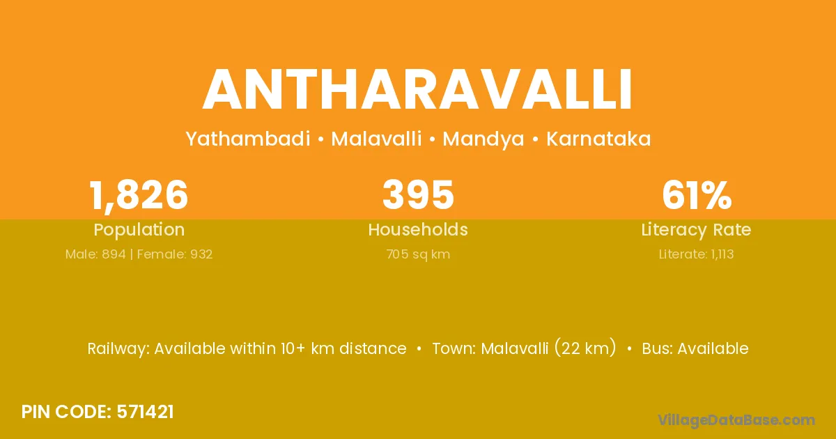 Malavalli (22 km) is the nearest town to Antharavalli village for major economic activities and is located approximately 22 km away.