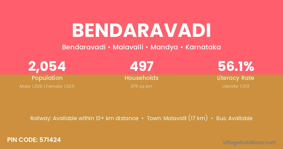 Malavalli (17 km) is the nearest town to Bendaravadi village for major economic activities and is located approximately 17 km away.