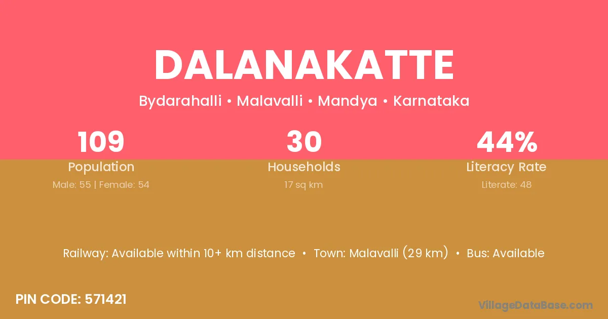 Malavalli (29 km) is the nearest town to Dalanakatte village for major economic activities and is located approximately 29 km away.