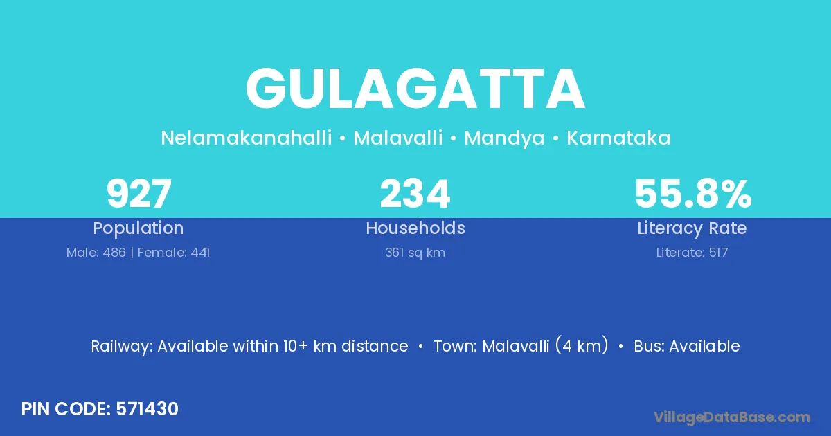 Malavalli (4 km) is the nearest town to Gulagatta village for major economic activities and is located approximately 4 km away.