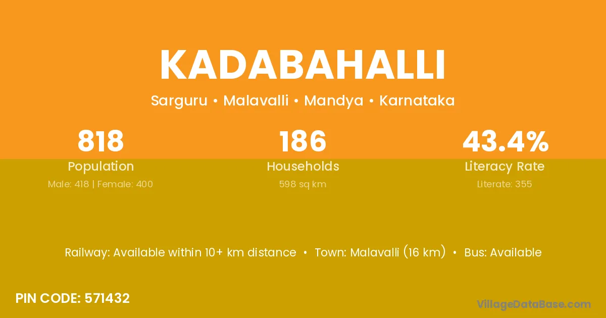 Malavalli (16 km) is the nearest town to Kadabahalli village for major economic activities and is located approximately 16 km away.