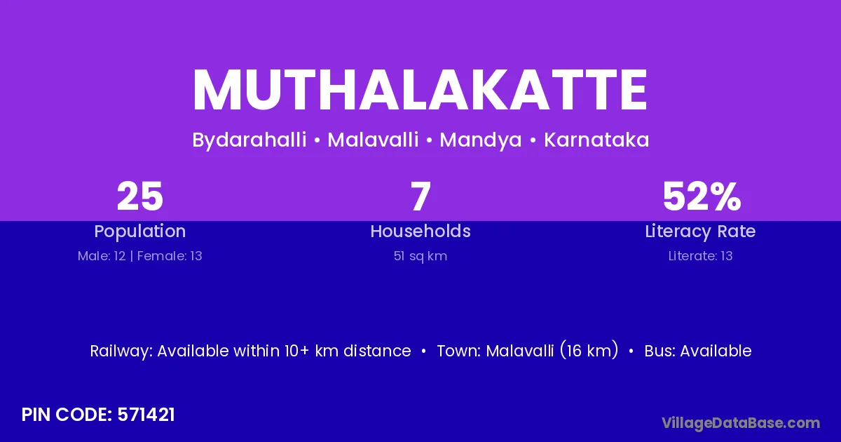 Malavalli (16 km) is the nearest town to Muthalakatte village for major economic activities and is located approximately 16 km away.
