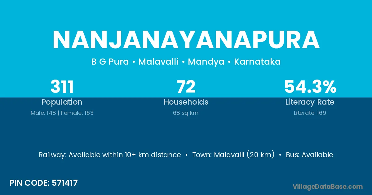 Malavalli (20 km) is the nearest town to Nanjanayanapura village for major economic activities and is located approximately 20 km away.