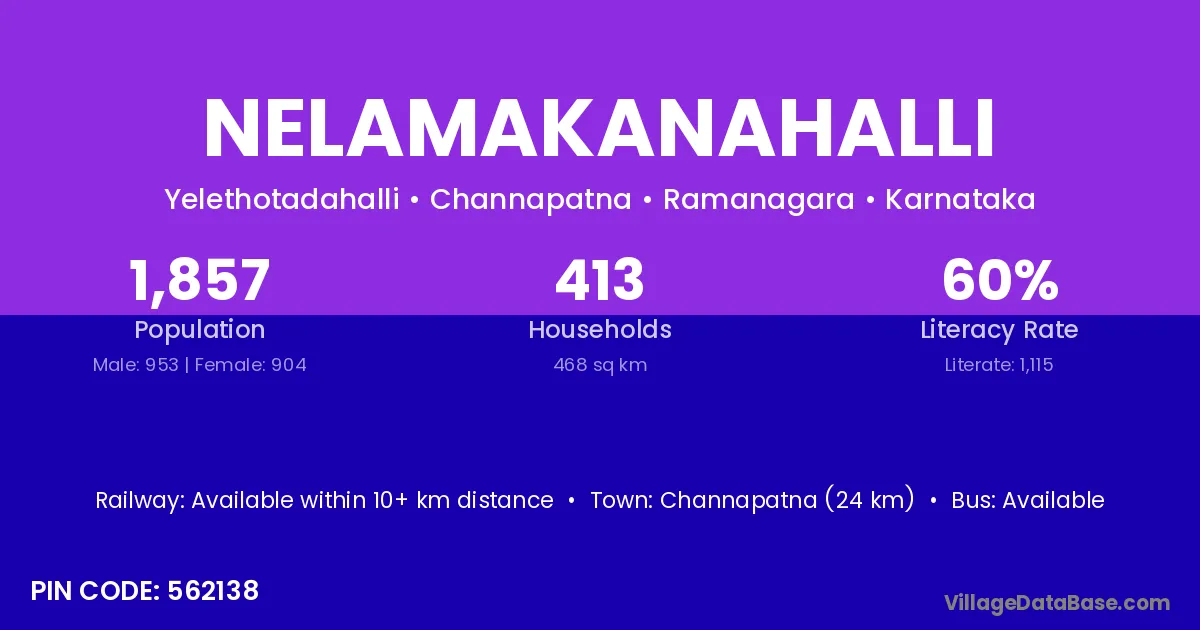 Malavalli (8 km) is the nearest town to Nelamakanahalli village for major economic activities and is located approximately 8 km away.