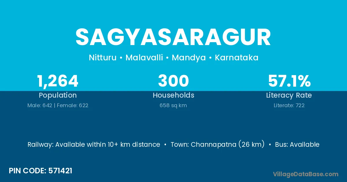 Channapatna (26 km) is the nearest town to Sagyasaragur village for major economic activities and is located approximately 26 km away.