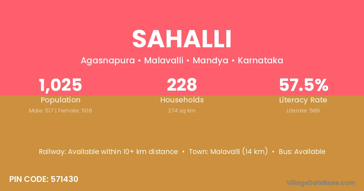 Malavalli (14 km) is the nearest town to Sahalli village for major economic activities and is located approximately 14 km away.