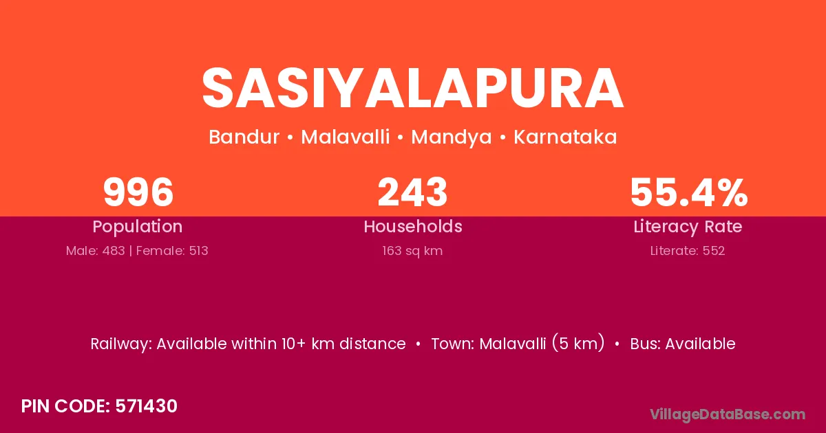 Sasiyalapura village has a total population of 996 people, of which 483 are males and 513 are females.