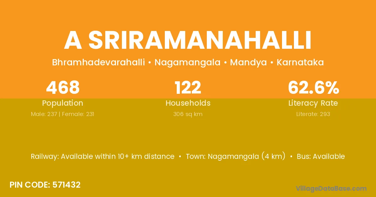 Nagamangala (4 km) is the nearest town to A Sriramanahalli village for major economic activities and is located approximately 4 km away.