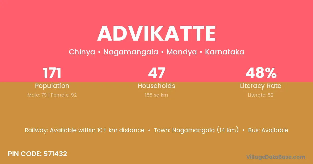 Nagamangala (14 km) is the nearest town to Advikatte village for major economic activities and is located approximately 14 km away.