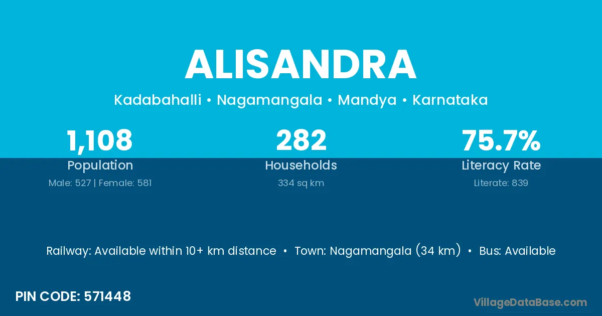 Nagamangala (34 km) is the nearest town to Alisandra village for major economic activities and is located approximately 34 km away.