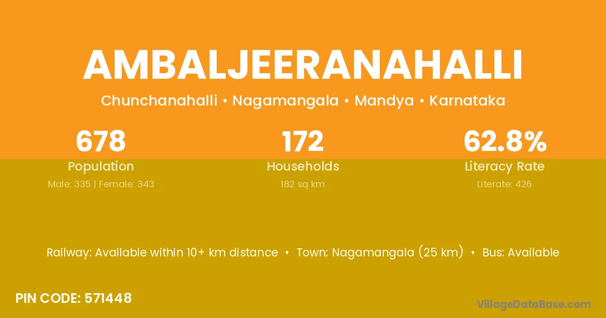 Nagamangala (25 km) is the nearest town to Ambaljeeranahalli village for major economic activities and is located approximately 25 km away.