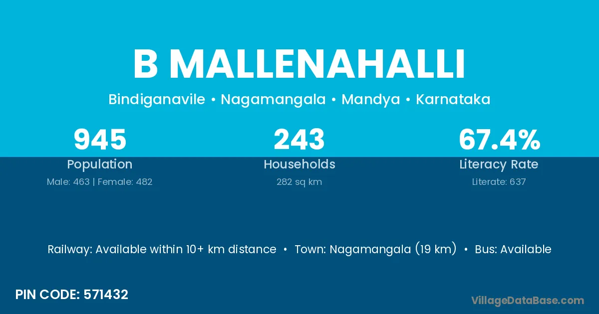 Nagamangala (19 km) is the nearest town to B Mallenahalli village for major economic activities and is located approximately 19 km away.